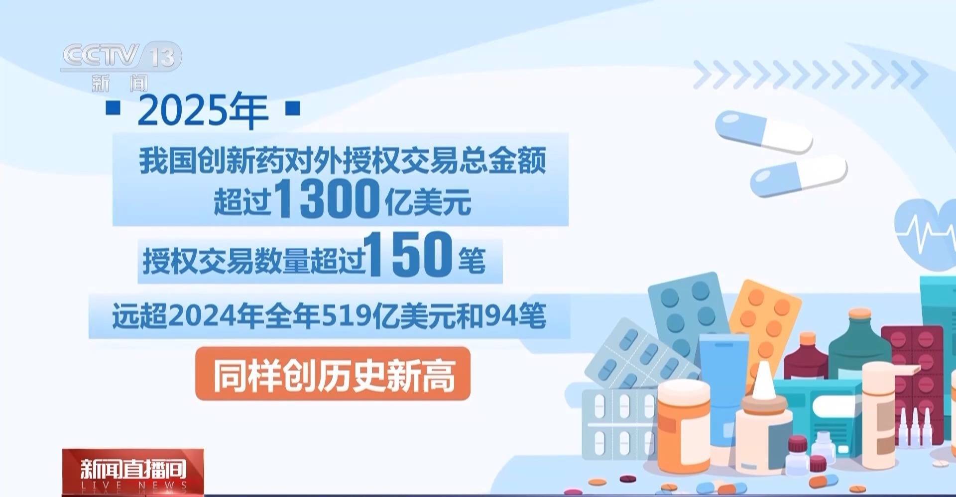 记者从国家药监局还获悉,2025年我国创新药对外授权交易总金额超过1300亿美元,授权交易数量超过150笔,远超2024年全年519亿美元和94笔,同样创历史新高。我国在研新药管线约占全球30%,位列全球第二。